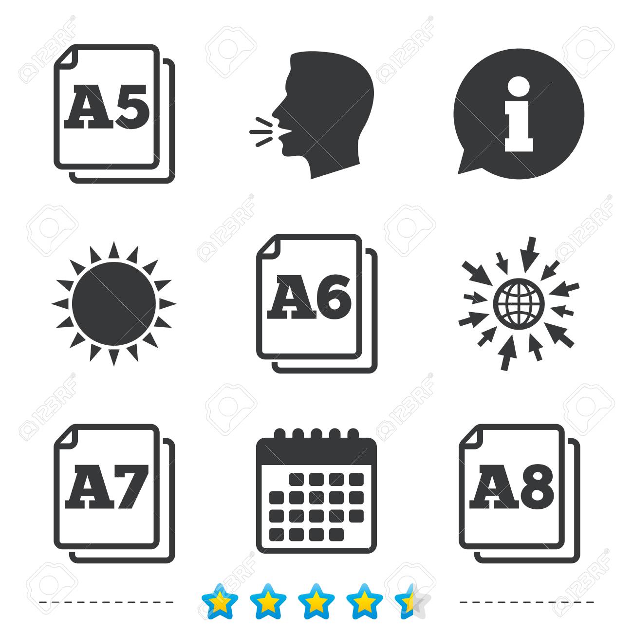 Iconos Estandar De Tamano De Papel Las Signaturas De Documentos A5 A6 Y A8 Pagina Signos Informacion Ir A La Web Y De Calendario Iconos Sun Y El Simbolo De Hablar