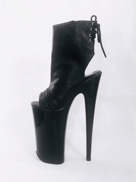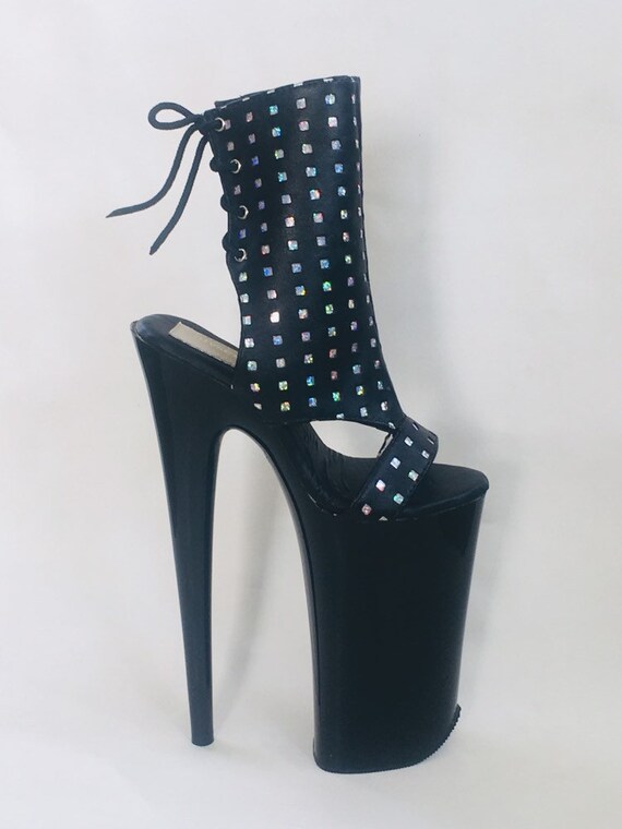 10 Inch Black Leather Holagram Detail Lace Ankle Boot Open Toe Etsy