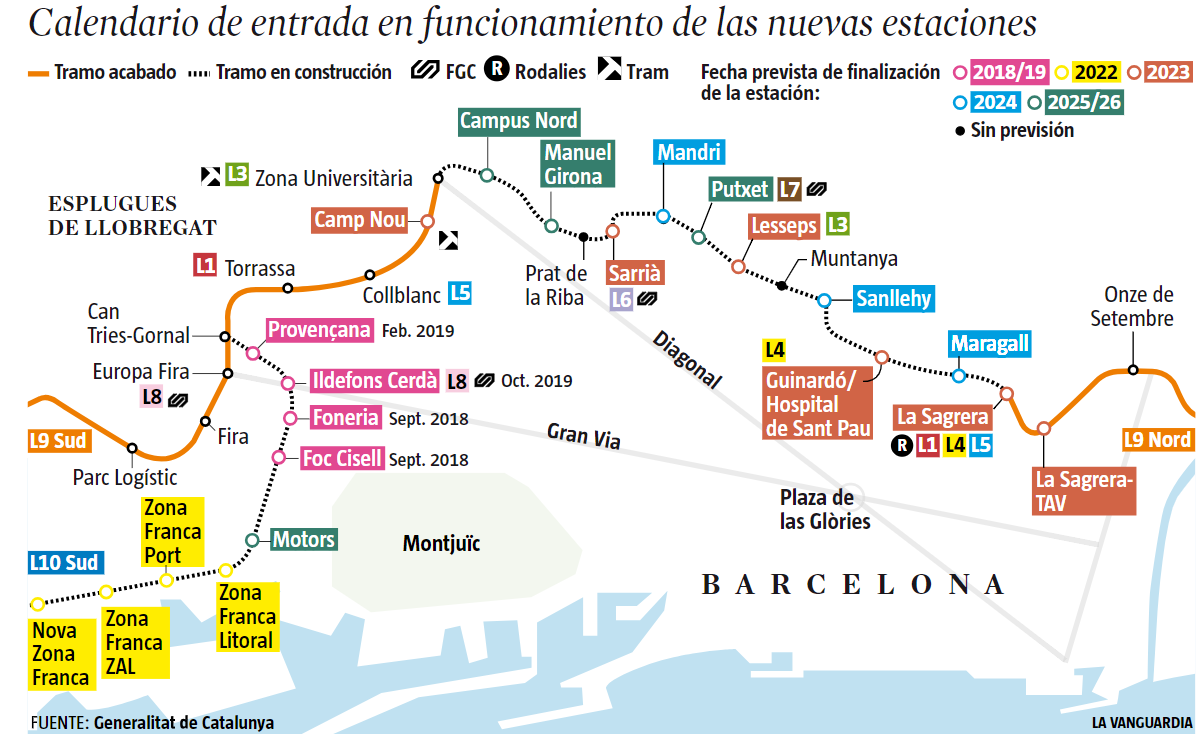 Mapa de la L9 AÚN POR ACABAR La línea 9 del metro tiene que unir Santa Coloma de Gramenet y Badalona con la Feria de Barcelona, la Zona franca y el Aeropuerto del Prat No obstante, actualmente solo funciona en sus tramos norte y sur Queda pendiente de ejecutar, por tanto, el tramo entre La Sagrera y la Zona Universitaria y que tiene que. The L9 of Metro has been divided into two parts The journey from Santa Coloma to La Sagrera L9 adopts the name of Nord, and L9 Sud stretch connecting stop Zona Universitària and get to the airport Stations Camp Nou , La Ribera and terminal Aeroport Carrega enter service in later phases. Operador TMB y FGC;.