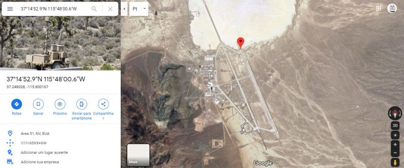 3724, ou 37°14'53" 115°48'1" ou 37 39' 18N 115 48' 54 W De brinde, uma caça invisível pra vc 34°38'17" 118°4'52" Video ensinando. Olá Fabiano, As coordenadas da Área 51 no Google Earth são Latitude 37°14'3652"N Longitude 115°48'4116"W Dependendo da versão do Google Earth que você estiver utilizando basta digitar no campo de pesquisa Area 51 que ele vai te levar até lá automaticamente. El área 51, es un término conocido por todos aquellos, quienes andan en permanente búsqueda de temas interesantes, que involucren conspiraciones, secretos y extraterrestres De hecho, con el pasar de los años, se ha convertido en un sitio la curiosidad de la gente por conocer ciertos detalles de esta zona, ha ido en crecimiento constante La información que se maneja es que se trata de un sitio remoto, en el desierto de Nevada en donde se han avistado naves espaciales, sin embargo, el.