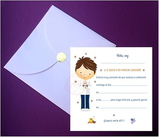 En esta categoría puedes comprar invitaciones para comuniones de niño Las invitaciones son muy económicas y con distintos diseños a elegir Incluyen sobre y grabación Filtro Mostrados 13 productos de 13 Invitación con espigas con objetos de comunión Desde 0,70€. Invitaciones de bautizo y comunión con papelería decorativa a conjunto Un bautizo o una primera comunión son una excusa maravillosa para reunir a familiares y amigos Elige el diseño que más te guste ¡Tienes un montón de tarjetas originales y con estilo para elegir!. Vela cristal comunión "ANGELITO NIÑO" Vela blanca en tarro de cristal con tapa metálica, personalizada con el nombre y la fecha de su Primera Comunión Un diseño elegante perfecto para comuniones modernas y con clase Un regalo de lo más bonito y original para que todos los invitados se lleven un recuerdo del gran día.