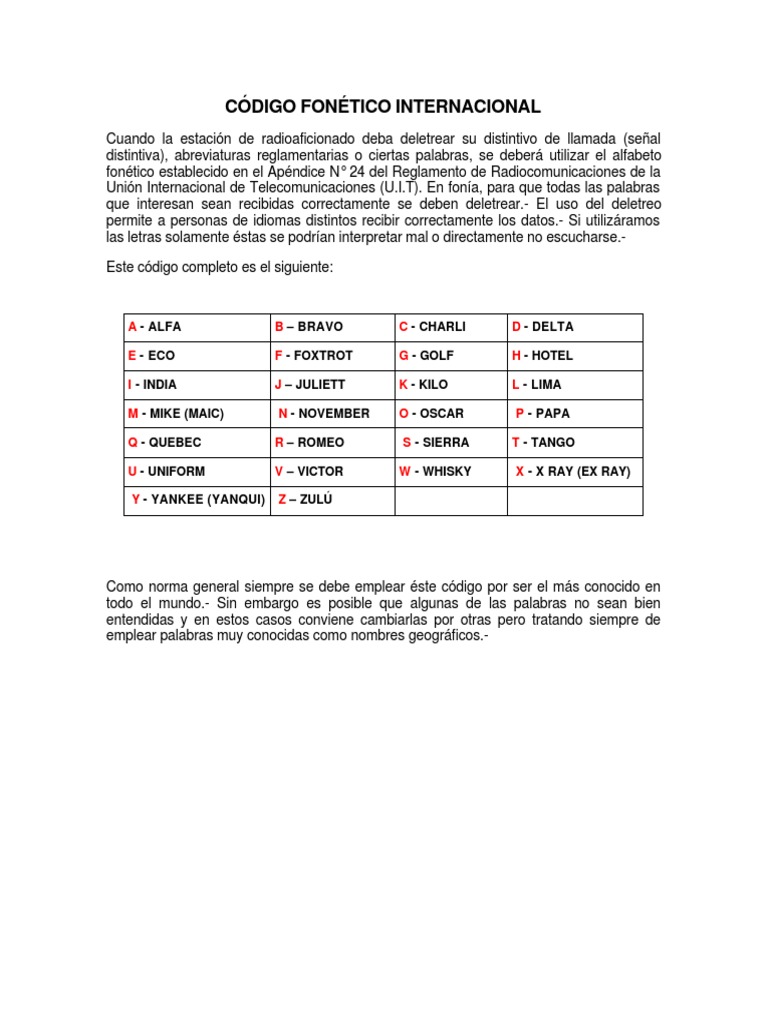 Esta lista de palabras están dentro del denominado alfabeto radiofónico, por lo que no debemos confundir con el Álfabeto Fonético Internacional Ahora a las practicas con nuestro alfabeto A Alfa B Bravo C Charlie D Delta E Echo F Foxtrot G Golf H Hotel I India J Juliett K Kilo L Lima M Mike N November O Oscar P Papa Q Quebec R Romeo S. Historia Es interesante hacer notar que el primer alfabeto fonético reconocido internacionalmente fue adoptado por la Conferencia Radial de la Unión Internacional de Telecomunicaciones (UIT) en 1927 y fue para el uso del servicio móvil marítimo;. CÓDIGO Q CÓDIGO FONÉTICO INTERNACIONAL QAP Escuta, escutar, à disposição Letras Palavras Pronúncias QAR Autorização para abandonar a escuta A Alpha AL – FA QRA Prefixo da estação ou do operador B Bravo BRA – VO QRI Tonalidade dos Sinais C Charlie CHAR – LIE QRK Legibilidade dos sinais D Delta DEL – TA QSA Intensidade dos sinais 1=péssima;2=.