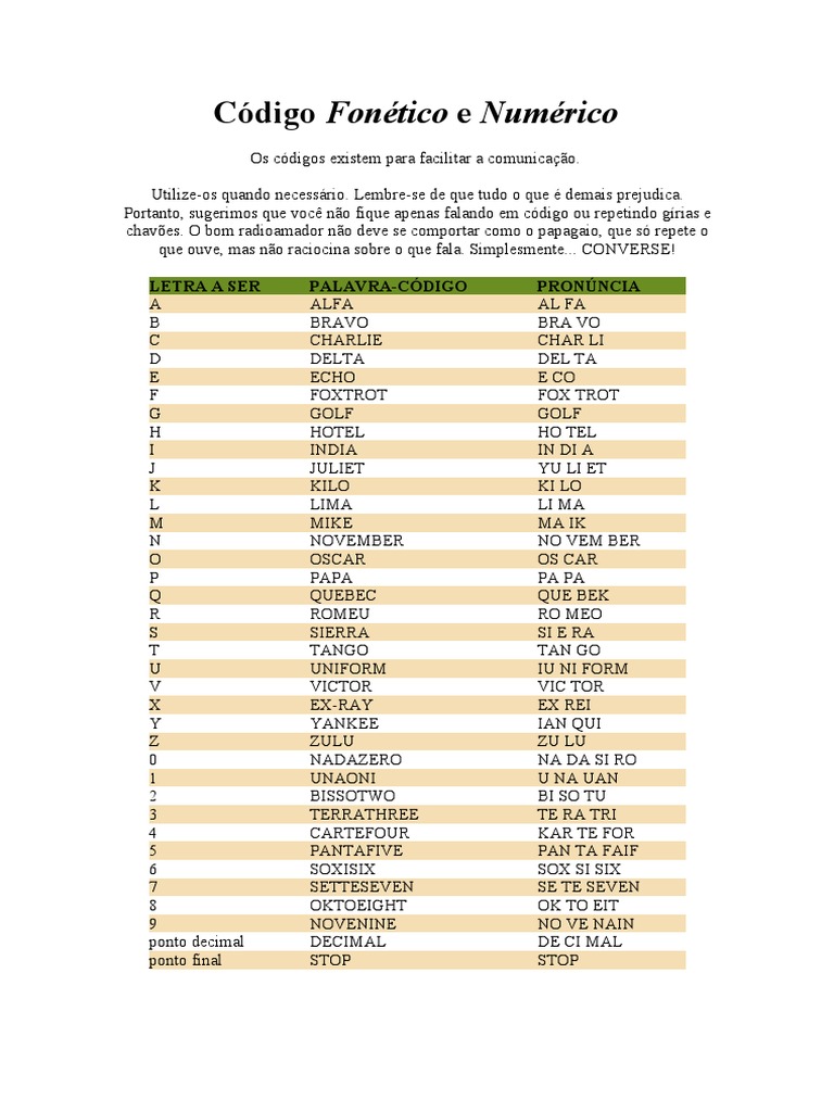 CÓDIGO FONÉTICO INTERNACIONAL Um alfabeto radiotelefônico (por vezes confundido com o alfabeto fonético) é um sistema de identificação das letras do alfabeto por meio de palavrascódigo, utilizado sobretudo na comunicação falada, especialmente por rádio, para soletrar palavras No mundo todo, existem inúmeros sistemas para identificar as letras do alfabeto e para unificálos. Codigo fonetico internacional arthur maximiano docx download free pdf cÓdigo letra cÓdigo fonÉtico a alpha b bravo c charlie d delta e echo f foxtrott g golf h hotel i india j juliet k kilo l lima m mike n november o oscar p papa q quebec r romeo s sierra t tango u uniform v victor w whiskey x xray y yankee z zulu internacional. Afla alfabeto bravo charlie codigo deletrear delta letra militar 933 (1519 votos) No sólo es militar, también se utiliza para comunicarse entre aviones, barcos y así no confundirse entre las letras tipo B de V o C de Z Sería una versión internacional de lo que solemos decir como C de casa, D de dedo deletrearíamos Noviembre.