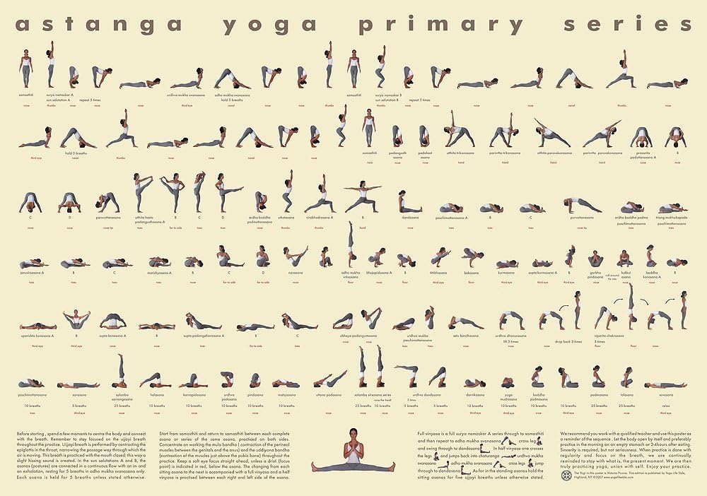 This free size chart of the Ashtanga primary series contains the opening and closing mantras, posture names, dristi, correct breathing and vinyasas Print it out and enjoy!. To download the Ashtanga Yoga Primary Series chart click on the image Bonsu Amoah Armstrong September 27, 16 I like the posese and im going to make effort to practice i will also find an experienced teacher to guide me Shamila May 8, 17 I need to downlod this picture for my reserch. The primary series is a foundational practice which provides the basis for the other five ashtanga vinyasa sequences As well as the postures, it includes a specific breathing technique, use of bandhas, drishti (gaze points) and coordinated movement with the breath The Sanskrit name for the primary series is yoga chikitsa, which can be interpreted as “yoga therapy” It is given this name because it is said to purify and heal the body.