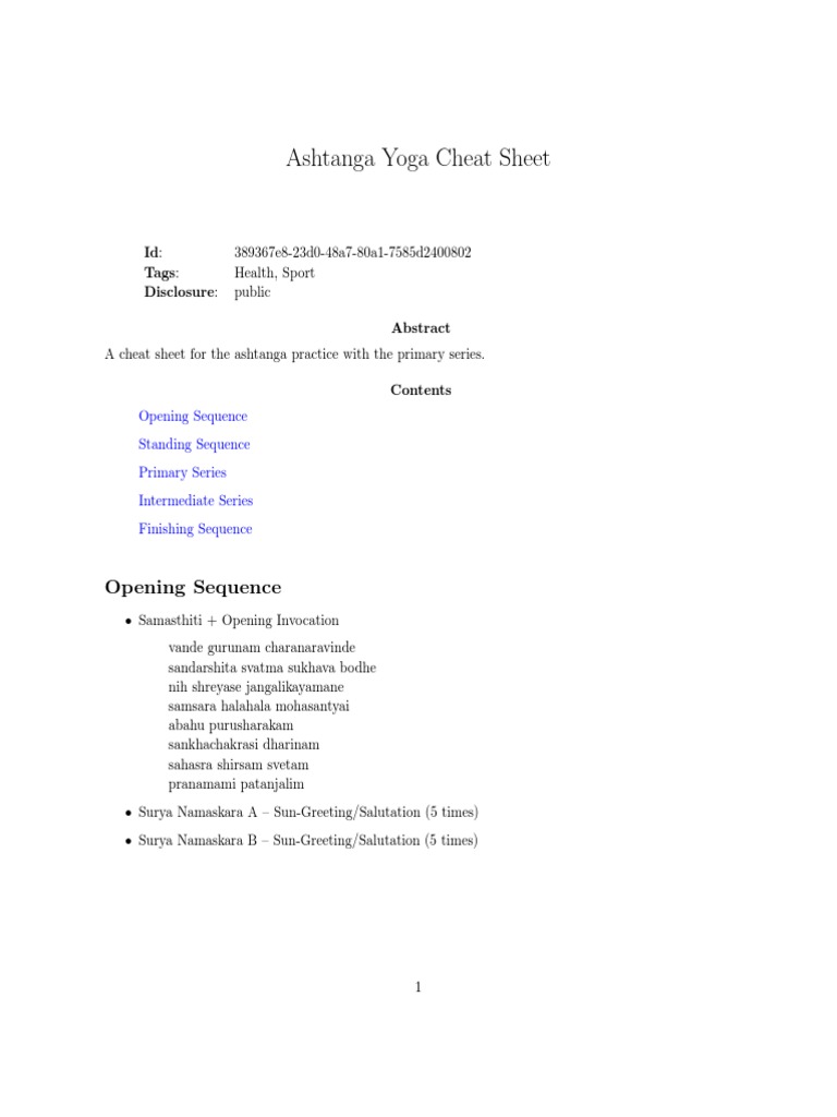 Ashtanga Yoga Cheat Sheet Id 3367e3d048a780ad s Health, Sport Disclosure public Abstract A cheat sheet for the ashtanga practice with the primary series Contents Opening Sequence Standing Sequence Primary Series Intermediate Series Finishing Sequence Opening Sequence • Samasthiti Opening Invocation vande gurunam charanaravinde. Unlike in a guided class, each student follows his own rhythm and his own physical conditions and is individually promoted by a teacher Mysore Yoga is a unique teaching method that meets all practitioners – from the absolute beginner to the most advanced. Ashtanga Yoga Primary Series in pictures Ashtanga Yoga is a dynamic form of yoga that follows a sequence of poses that should be committed to memory.