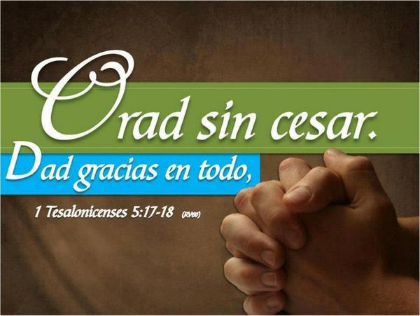 Orad sin cesar 1 Tesalonicenses 517 Este versículo es corto, pero encierra una verdad tremenda que todos necesitamos saber y practicar, puesto que la base sólida que mantiene al cristiano es la oración Seguramente has escuchado o leído mucho acerca de la oración, pero no has practicado lo que ella significa Orar es simplemente hablar con Dios, es platicar con tu creador, es contarle como va tu vida y lo mucho que lo amas, esas oraciones son lindas. Orad sin cesar RVR1960 Biblia Reina Valera 1960 Version Cancel Bible Language Español (América Latina) Free Reading Plans and Devotionals related to 1 Tesalonicenses 517 Praying Continually 4 Secrets To Praying For Your Husband Resolving Tension What Is Your Best Choice?. Estos mensajes son grabados durante nuestros servicios en español del domingo en la mañana Te invitamos a que nos acompañes Nuestros Servicios en ESPAÑOL s.