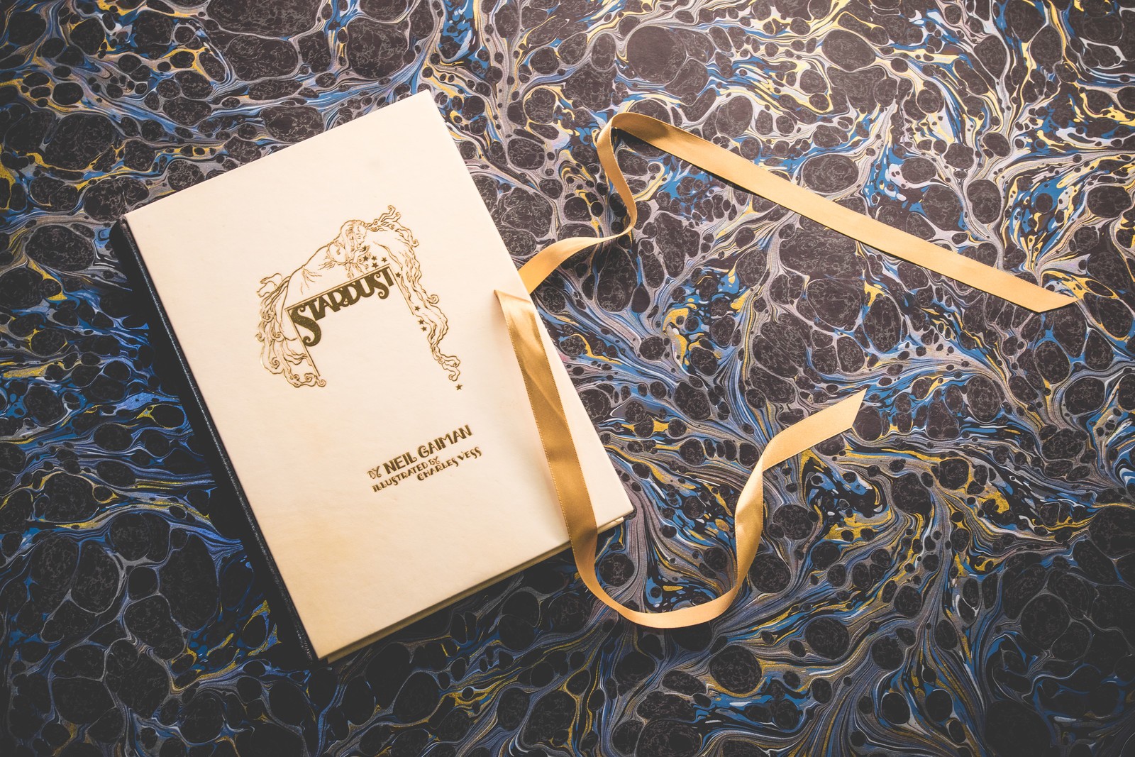 Stardust is a 1999 fantasy novel by British writer Neil Gaiman, usually published with illustrations by Charles Vess Stardust has a different tone and style from most of Gaiman's prose fiction, being consciously written in the tradition of pre Tolkien English fantasy, following in the footsteps of authors such as Lord Dunsany and Hope Mirrlees. Stardust is a 1997 fantasy novel by British writer Neil Gaiman, usually published with illustrations by Charles Vess Stardust has a different tone and style from most of Gaiman's prose fiction, being consciously written in the tradition of preTolkien English fantasy, following in the footsteps of authors such as Lord Dunsany and Hope MirrleesIt is concerned with the adventures of a young. New and unread, square and solid with firm and unblemished marbled boards with sharp tips 'Stardust' sprayed page tops and place marker ribbon Book was issued without a dustjacket The beautiful slipcase is illustrated by Vess with the title, and names of author and artist in gold foil inlay.