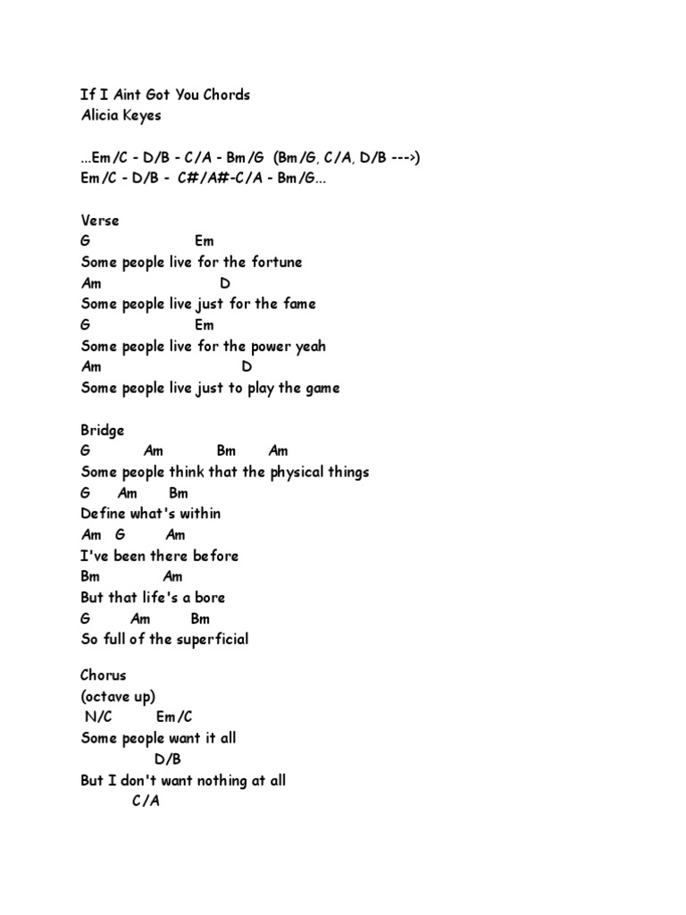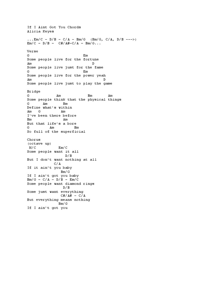 (octave up) C7 Bm7 Some people want it all But I don't, want nothing at all Am7 G7 If it ain't you baby If I ain't got you, baby, G7 G4/A C7 Bm7 Some people want diamond rings Some just want everything m7 Am7 G7 But everything means nothing If I ain't got you. If I Aint Got You chords by Alicia Keys 2,756,032 views, added to favorites 59,602 times Difficulty novice Tuning E A D G B E Key C Author Esteban Miranda a 70 9 contributors total, last edit on Nov 29, 18 View official tab We have an official If I Aint Got You tab made by UG professional guitarists. This is how i played Alicia Keys If I Ain't Got You on Acoustic/Classical Guitar hope may help you to play it too Never miss our update!.