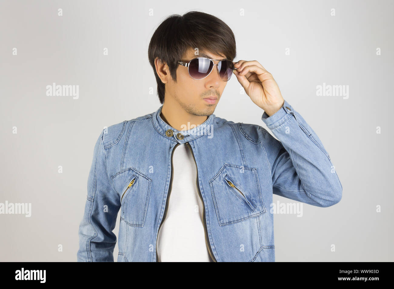 Young Asian Man In Jeans Jacket Or Denim Jacket Touching Sunglasses Denim Or Jeans Jacket Men Fashion On Gray Background Stock Photo Alamy