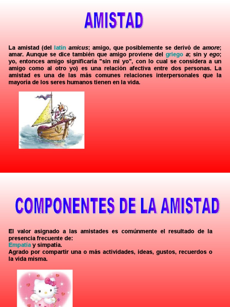 Español ·↑ 1,0 1,1 1,2 1,3 «amistad», Diccionario de la lengua española (14), 23ª ed, Edición del Tricentenario, Madrid Real Academia Española. FILÍA, diosa de la amistad, representada normalmente como una mujer que lleva el pecho izquierdo al descubierto, posando sobre él la mano derecha (y el lema "De cerca y de lejos") HESTIA es la. Amistad y amor El amor y la amistad tienen en común el profundo afecto, el respeto, la lealtad y el sentido del compromiso De hecho, en la amistad hay siempre amor y en el amor, por lo general, amistad Se diferencian en varias cosas Por ejemplo, el amor se propone durar para siempre, y, de hecho, el voto matrimonial así lo establece.