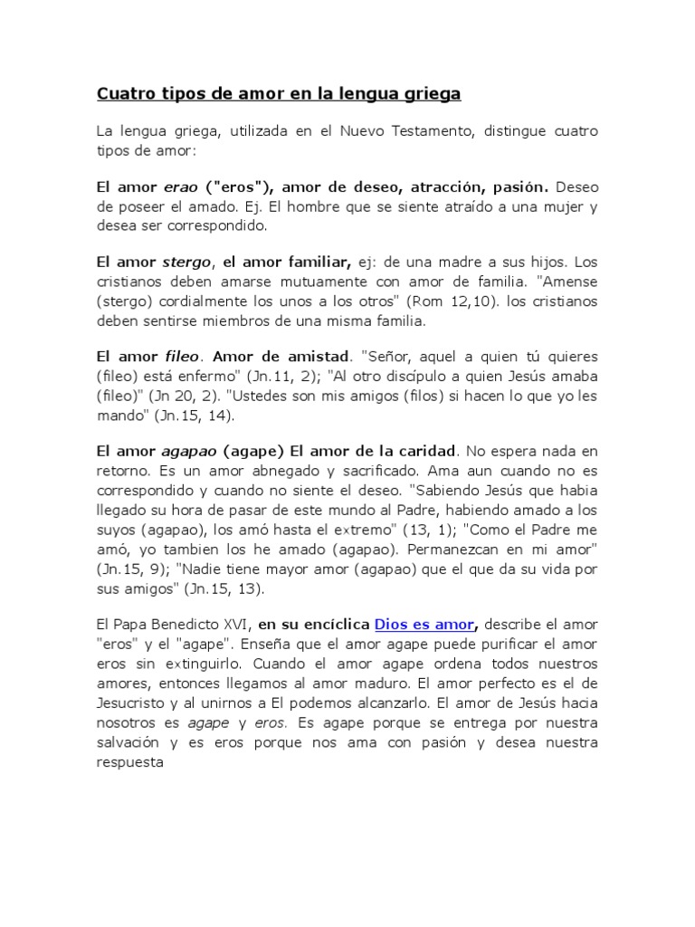 En este sitio puede leer los textos del Griego del Nuevo Testamento con las variantes textuales más importantes Haciendo click en una palabra Griega en el texto podrá encontrar información sobre la palabra;. “agapē”, o amor espiritual y "storgé", o amor que implica compromiso Philia ha sido definida también como la intención de. Lista de Frases en latín de Amistad y su traducción al español Ab amando ductum est amicitiae nomen Del verbo amar se deriva la palabra amistad (Gracias Gonzalo Rocha Muñoz) Ab amico reconciliato cave Guárdate de amigo reconciliado (Gracias Mani Moreira);.