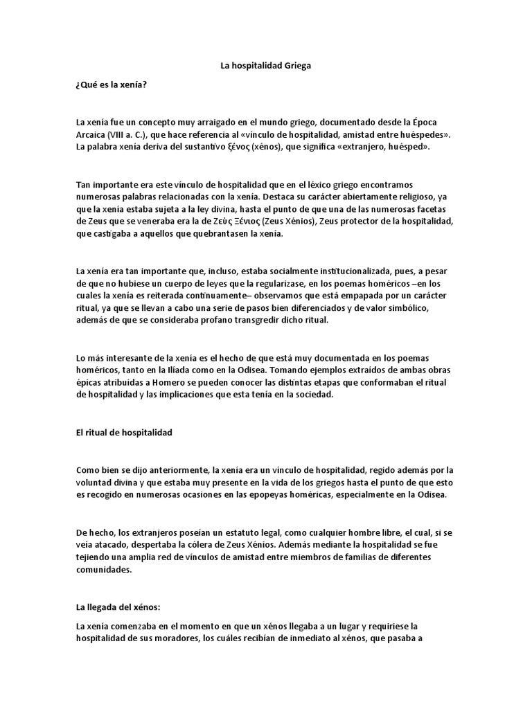 En esta reflexión sobre el humanismo griego, hay un tema que puede merecer una atención especial dentro del marco de este congreso sobre la amistad, a saber, la antiquísima tradición en torno a la hospitalidad dentro del ámbito de la cultura griega. Me estoy refiriendo a la “amistad de los buenos” la que definió Aristóteles, aquel filósofo griego antiguo que calificó a los amigos en tres categorías una los "utilitarios”, otra los. Hospitalidad y amistad en la cosmovisión griega 6 empezaron a formar naciones, las relaciones entre las personas y entre los clanes fueron debilitándose Persistió la civitas, y respecto de ella, la condición de estar fuera o dentro De este.