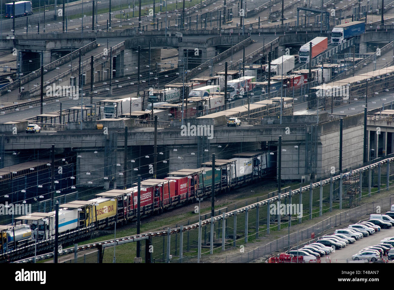 Eurotunnel Folkestone Kent Inglaterra De Marzo De 19 Trafico De Camiones En Trenes De Carga Para