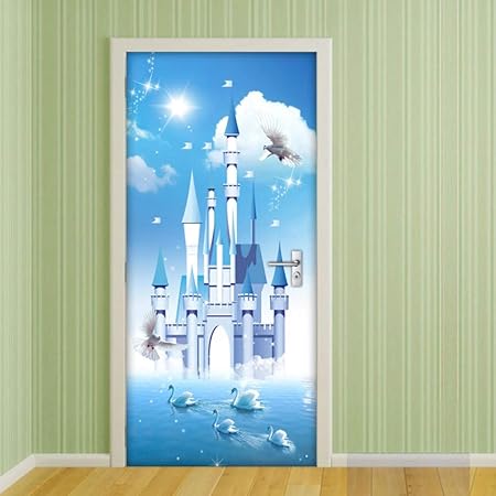Wbaini Cielo Azul Nubes Blancas Lago De Los Cisnes Castillo Azul 3d Habitacion De Los Ninos Decoracion De La Puerta Del Dormitorio Pegatinas Autoadhesivas Papel Tapiz De Vinilo Ninos Amazon Es Bebe