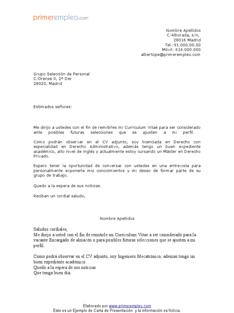 La carta de presentación es uno de los documentos más importantes en su trabajo buscar Una buena carta de presentación leerá tu CV y te hará avanzar la etapa de entrevista del proceso de contratación del asistente administrativo Destaca entre la multitud con una carta de presentación profesional bien escrita. CV y cartas de presentación Formato de carta de presentación cómo hacer la carta ideal September 8, La forma en que organices tu carta es casi tan importante como lo que escribes en ella Cumplir con los estándares típicos es especialmente importante teniendo en cuenta que las habilidades de comunicación son importantes en casi. La carta de presentación es una oportunidad para disponer de un primer contacto con la empresa En esta web encontrarás consejos para redactar una carta, ejemplos de cartas de presentación adaptadas a una situación determinada y otros modelos y plantillas de carta de presentación para que te inspires y realices tus propias cartas.
