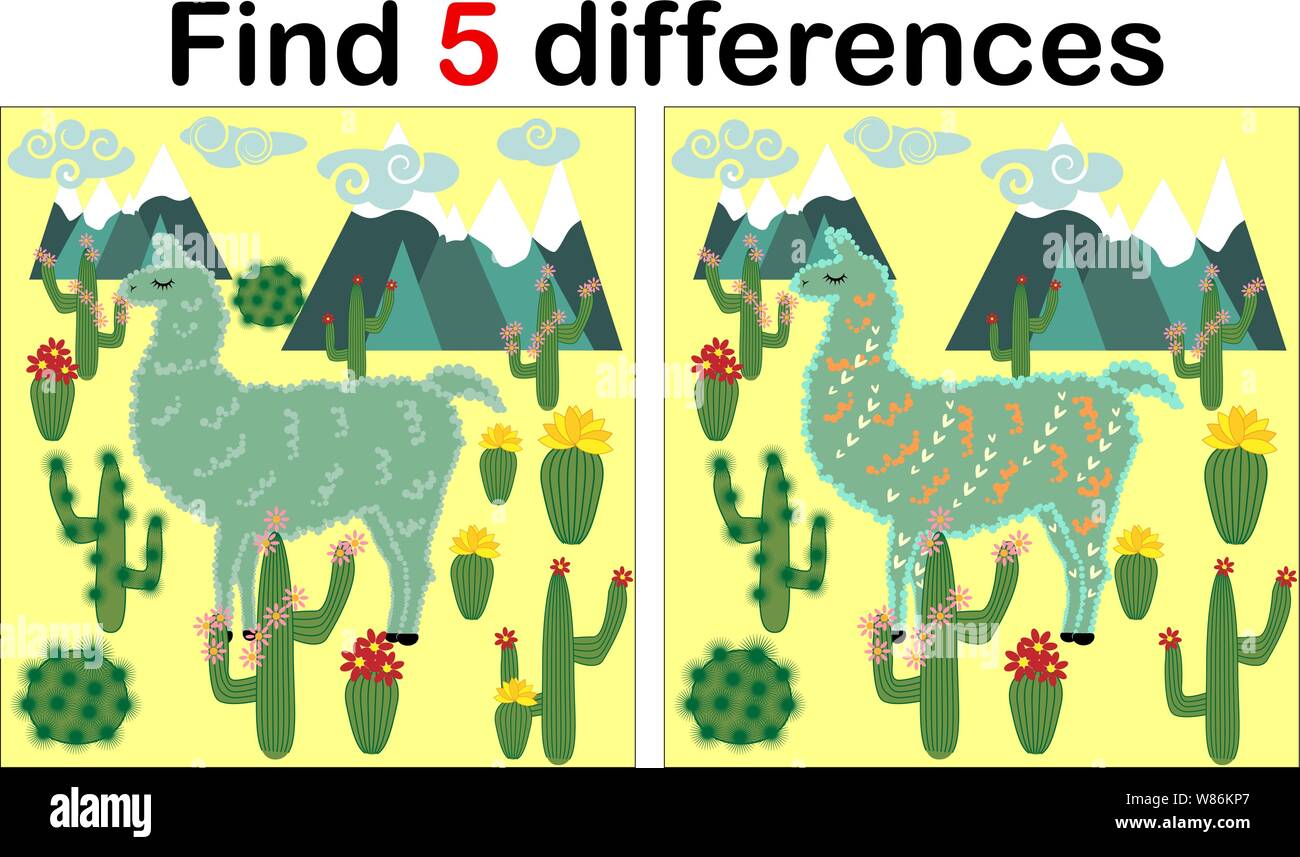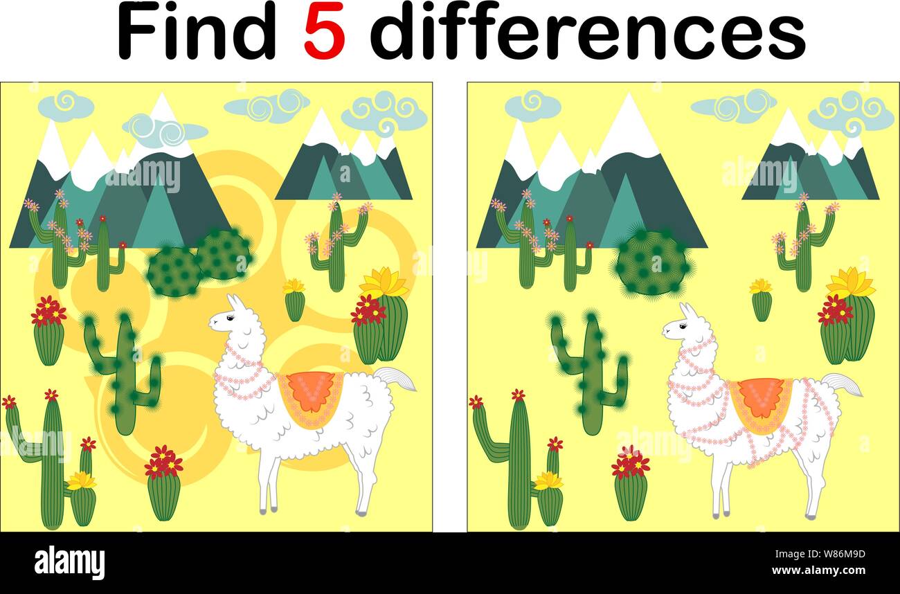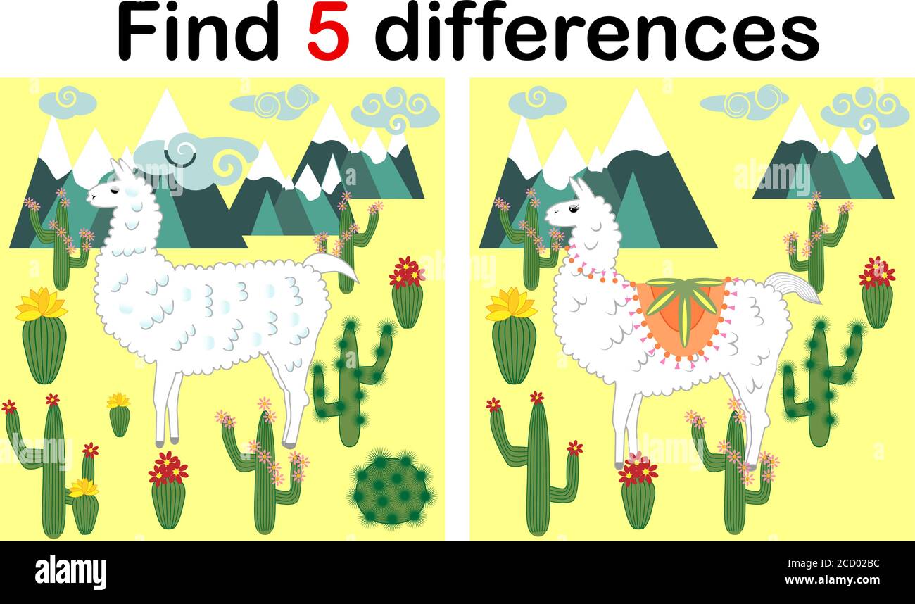 Encontrar Las Diferencias Entre Las Imagenes Juegos Educativos Para Ninos Dulce Llama Alpaca Entre Cactus Y Montanas Imagen Vector De Stock Alamy