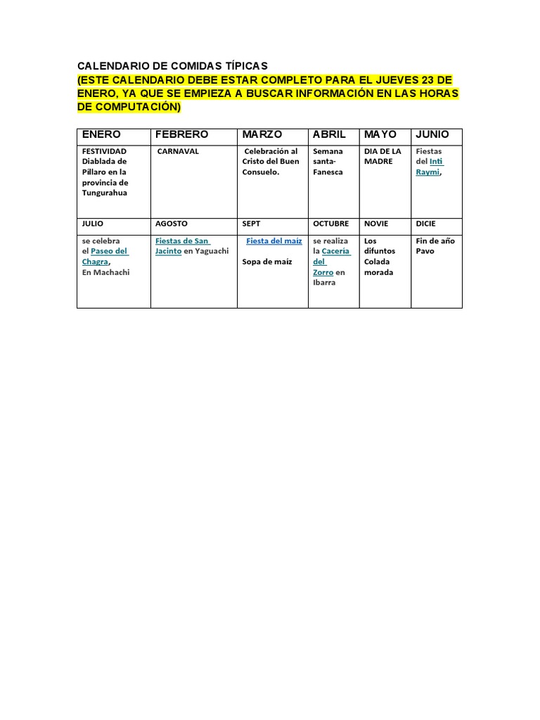 Calendario De Comidas Tipicas Este Calendario Debe Estar Completo Para El Jueves 23 De Enero Ya Que Se Empieza A Buscar Informacion En Las Horas De Computacion Enero Febrero Marzo Abril Mayo