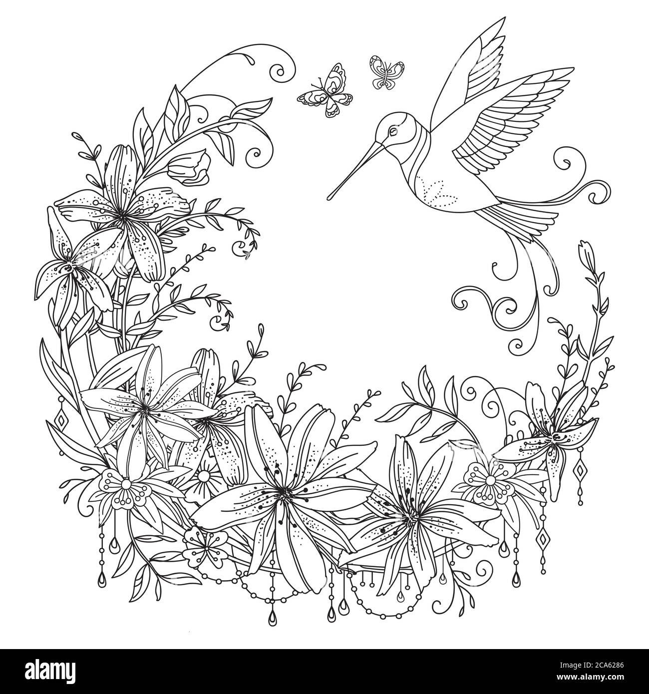 Vector Colorear Flor Ornamental Con Colibri Y Flores En Composicion Circular Ilustracion Decorativa Dibujo De Contorno Negro Aislado En Blanco Imagen Vector De Stock Alamy