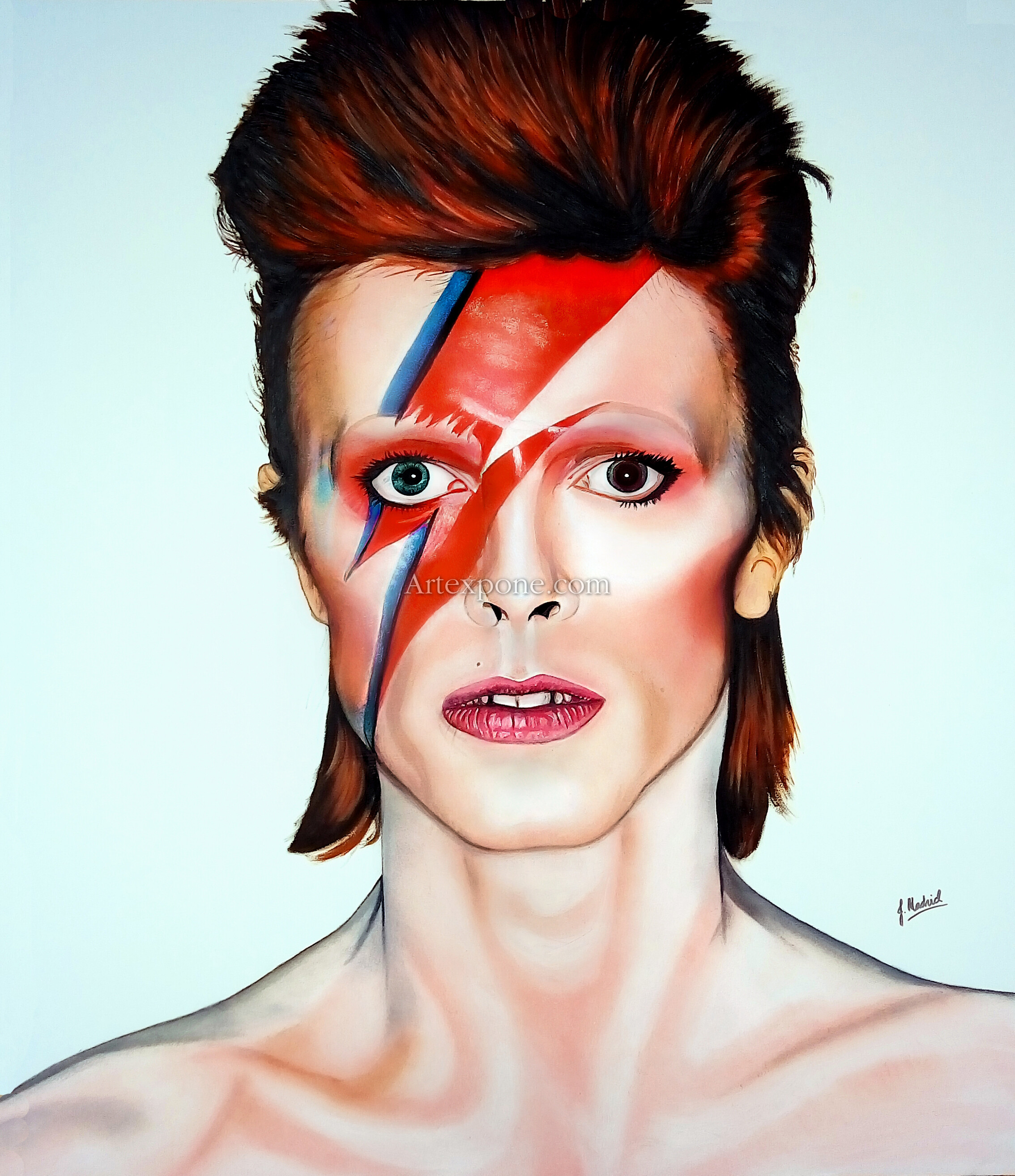 Pero la fama ya había sonreído al Duque Blanco más de cuatro décadas antes, en 1972, cuando publicó su quinto álbum de estudio "The Rise and Fall of Ziggy Stardust and the Spiders from Mars", lleno de letras misteriosas y electrizantes, y acompañadas por su imagen, tan espectacular como ambigua. Song Starman (Original Single Mix, 12 Remaster). El duque blanco José María Madrid Sanz óleo sobre lienzo 81 x 70 cms 1000,00 €.