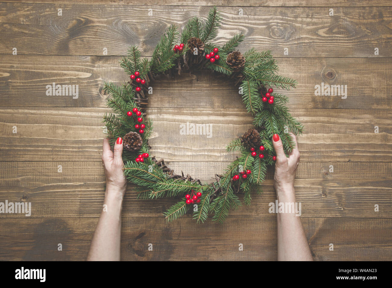 Corona De Navidad Hechas De Ramas De Abeto Con Bayas De Acebo Sobre La Plancha De Madera Mano Femenina Sosteniendo Corona Vista Desde Arriba Fotografia De Stock Alamy