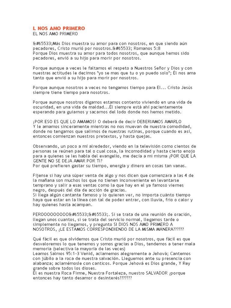 Amo a Dios, El me amó primero En este tiempo de medios de comunicación uno ya no mide las consecuencias de sus comentarios Oremos a Dios para que podamos volvernos buenos administradores de. Amo a Cristo, Amo a Cristo, Él es mi Dios, mi Salvador Amo a Cristo Amo a Cristo Porque Él me amó primero a mí Agregar a la playlist Tamaño A Restaurar A Cifrado Imprimir Corregir Somos el Pueblo de Dios Tus Ojos Revelan Levántate y Sálvame Tu Mirada Jesus Mi Buen Pastor. “Nosotros le amamos a él, porque él nos amó primero” I Juan 419 Si yo le preguntara a usted por qué Dios lo creó a usted, que respondería?.