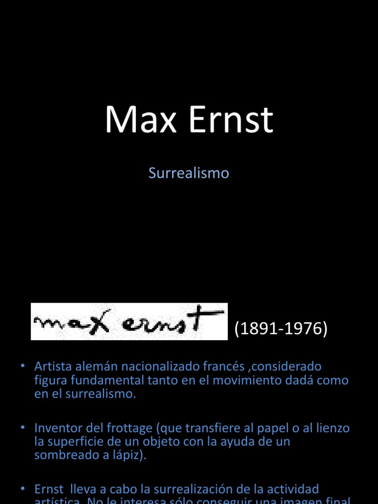 Max Ernst 19 enero 11 » Artistas » 11 Comentarios Pintor del movimiento Surrealista y Dadà, creativo increíble, Max Ernst llama la atención con sus pinturas de expresión fuerte y tema confuso y retorcido Como toda obra surrealista, la pintura se impregna del subconsciente y la imaginación Max estudió filosofía y psiquiatría. Pero bien dicen que nada dura para siempre, ni siquiera los grandes amores El tiempo de paz y desenfreno, de gozo y de creación, muy pronto se vería arrebatado por el estallido de la Segunda Guerra Mundial, que por razones superiores a ellos, pondría fin a su relación En 1939 comienza una persecución hacia Max Ernst, quien era alemán con ideas antifascistas. Para él la realización de la obra es una actividad surrealista en síEn este sentido cualquier técnica es válida con tal de conseguir, con la mayor perfección, el equivalente de la escritura automática, es decir la.