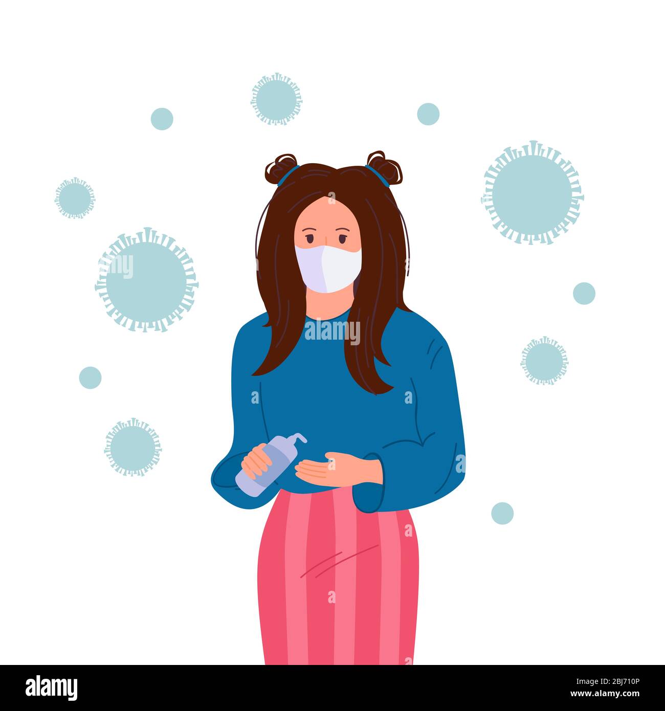 Nina Joven Estudiante Usando Mascara Medica Protectora Para Prevenir El Virus Covid Usa Un Antiseptico Pare La Caricatura Pandemica Guarde La Salud Permanezca En Casa Usando Una Mascara Quirurgica Ilustracion Vectorial Imagen