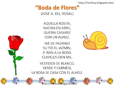 POEMA Aquella rosita, nacida en Abril quería casarse, con el alheli Irá de padrino, su tío el jazmín, e irán a la boda, claveles cien mil Vestida de verde, blanco y carmesí la rosa se casa con el alhelí. Bodas de flores e frutas é o nome dado à comemoração dos 4 anos de casamento de um casal Bodas tem origem na palavra latina "vota", que significa promessaA tradição de comemorar os aniversários de casamento surgiu na Alemanha, especialmente com a celebração dos 25 e dos 50 anos de casados. POEMA BODAS DE FLORES Guardado por Dianita Escobal 36 Rimas Cortas Poemas Cortos Para Niños Poemas Para Niños Trabalenguas Infantiles Adivinanzas Y Trabalenguas Cuentos Cortitos Canciones Infantiles Preescolar Letras De Canciones Infantiles Poesia De La Primavera.