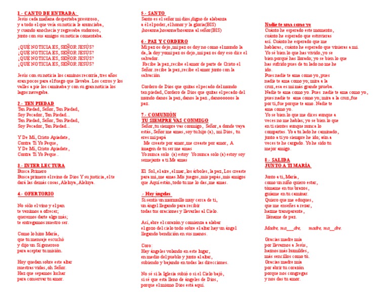 No os la doy como la da el mundo No se turbe vuestro corazón ni se acobarde Habéis escuchado que os he dicho Me voy y vuelvo a vosotros Si me amarais os alegraríais de que vaya al Padre, porque el Padre es mayor que yo Os lo he dicho ahora antes de que suceda, para que cuando suceda creáis. La paz te dejo mi paz te doy no como el mundo la da que no se turbe tu corazon ni tengas miedo no tengas miedo la paz te dejo mi paz te doy (Bis) Coro Estas cosas que hablo para que en mi tengas paz en el mundo tendras afliccion pero confia confia por que e vensido yo e vensido yo e vensido al mundo recibe recibe paz la paz mde Cristo mi paz yo. Y concédenos la paz " (2) Mi paz os dejo Mi paz os doy" el mundo no te dará " (2) Si tienes alguna pena En tu vida sonríe No hay motivo de tristeza Pues es Cristo quien te ama Ríe cuando llores Y serás como la brisa, Y dejar el mundo atrás (2).