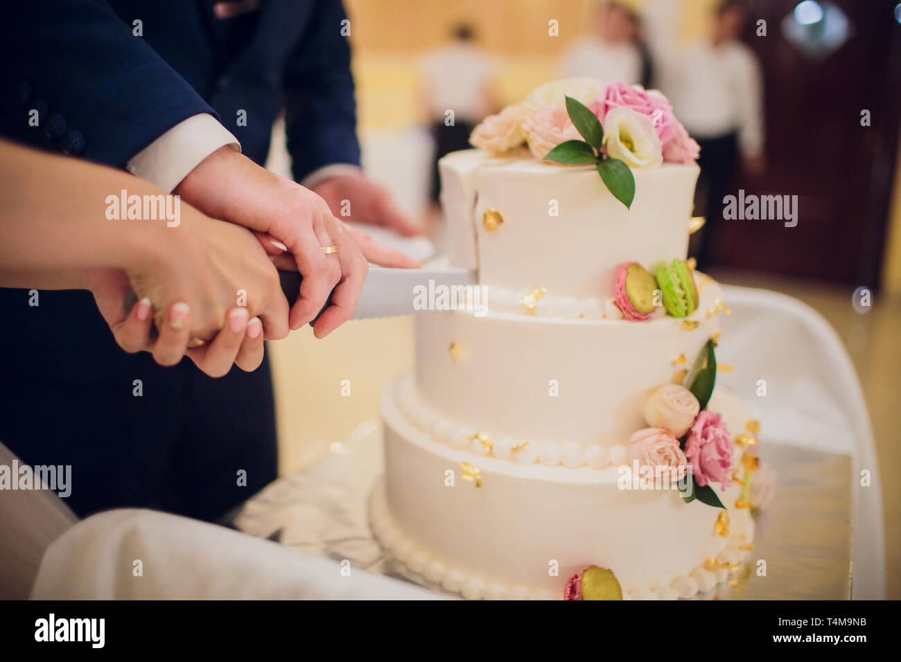 Cerca De Los Novios Cortando El Pastel De Bodas Fotografia De Stock Alamy