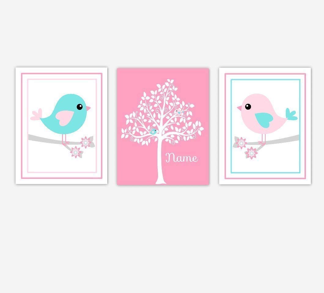 Amazon Com Baby Girl Nursery Art Pink Aqua Blue Birds Silhouette White Tree Personalized Decor 3 Unframed Prints Handmade