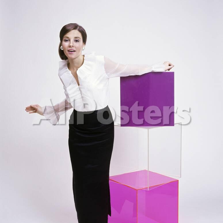 1960s Brunette Woman Wearing Formal Outfit Long Black Skirt Ruffled White Blouse By Purple Plastic Cubes Stock Image Ks Fotosearch