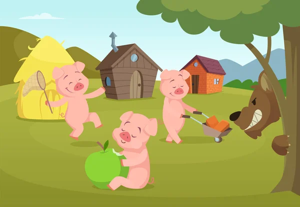 Tres Cerditos Y El Lobo Malo Vector Premium