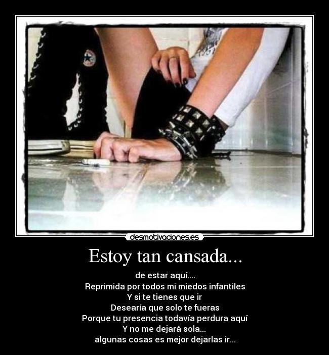 Estoy cansada tan cansada de todo lo que he brindado Que hoy Hoy ya no quiero hacerlo, ya quiero descansar Quiero por un día que todo lo que doy me sea brindado a mí Solo por Hoy Dejaré que la vida me lleve y me dejaré llevar Mañana quizá y solo quizá ¡¡ VOLVERÉ A SER LA MISMA !!. "Estoy siempre cansado" estas pueden ser las causas de tu fatiga diaria Hay muchos motivos que explican la fatiga en la rutina diaria, aunque pensemos que si arrastramos cansancio sólo es porque. Read Estoy tan cansada from the story Mis madres by VanessaMatos442 (Vanessa Matos) with 2,057 reads camrenisreal, camren, violencia Narra Camila Vanessa.