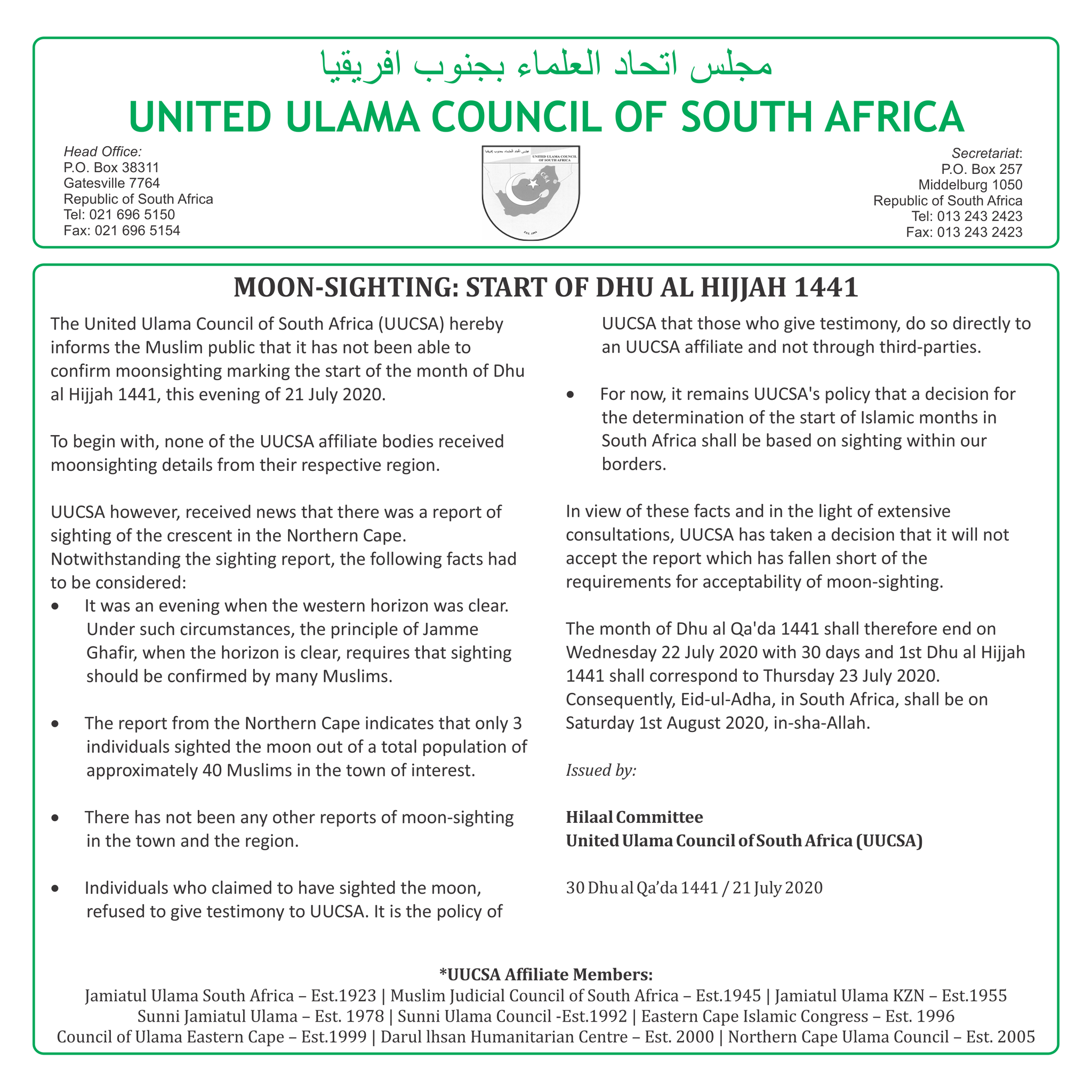 Jamiatul Ulama Sa Uucsa Statement Decision On The Start Of Dhu Al Hijjah 1441