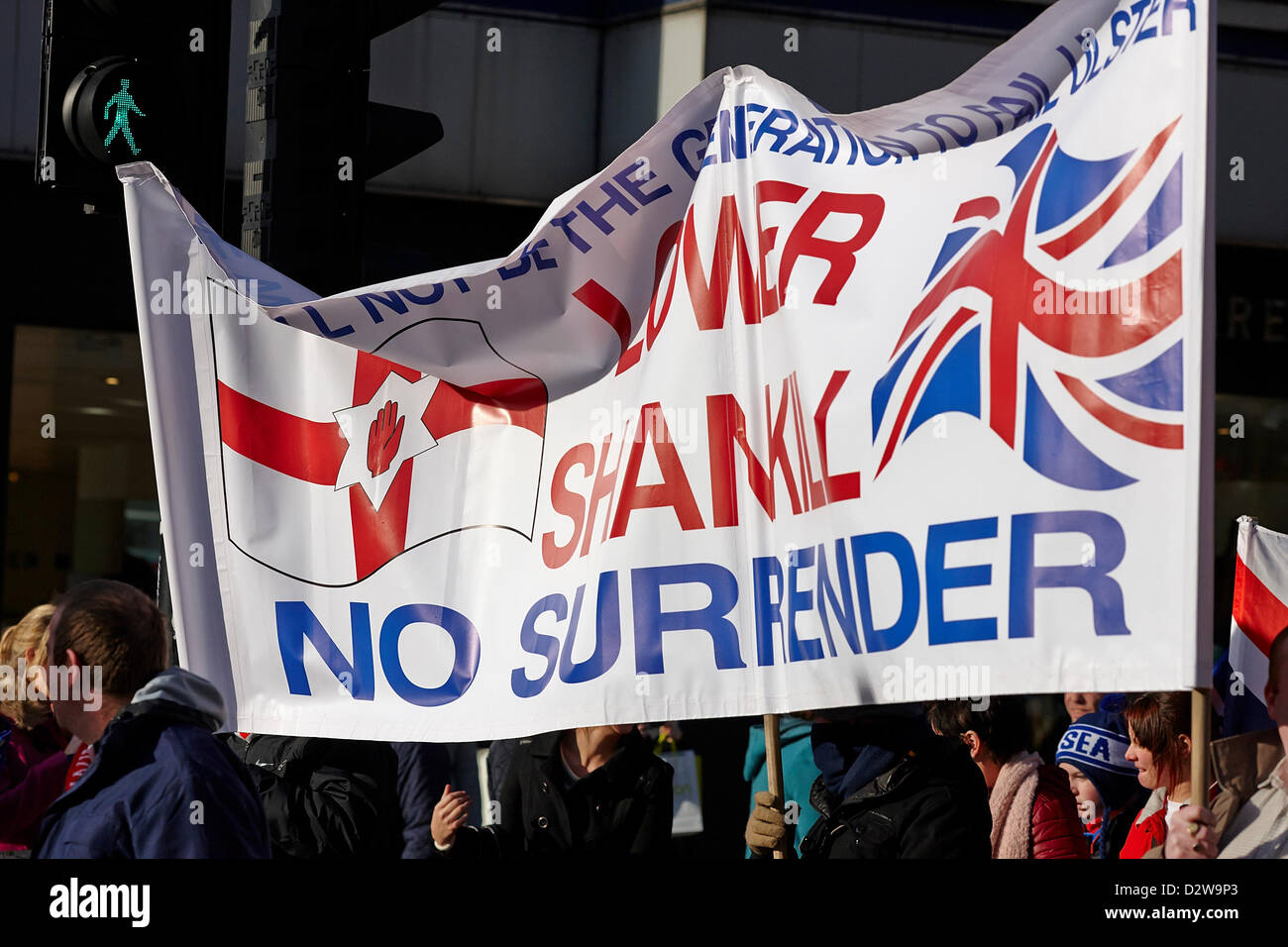The DUP has slammed a major policy change by Belfast City Council that will make Irish language street signs easier to erect T he unionist party said it "will cause disharmony and resentment. Some protesters broke through police lines and tried to storm into the hall one woman shouted 'no surrender' The union flag was taken down from Belfast City Hall on the morning after the council. Outside Belfast City Hall as he addressed tens of thousands of loyalists protesting against the signing of the November 1985 AngloIrish Agreement "No surrender US executes only woman.