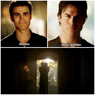 Damon y Stefan en las novelas nacieron en el año 1500, mientras que Damon y Stefan en el programa de televisión, nacieron durante la década de 1800 Stefan tiene 17 años de edad cuando muere y se convierte en un vampiro y Damon es de 21 años cuando muere y se convierte en un vampiro, aunque la edad exacta de Damon no se ha confirmado. Alaric, Elena y Damon se van al bosque a buscar a Stefan, en medio del bosque aparece un lobocasi híbrido en transición, y estuvo a punto de atacar a Damon, luego el lobo se convierte, y Damon empieza a correr para que lo persiga en el momento que lo iba a atacar aparece Stefan, y le dice que se lleve a Elena lejos y que lo deje en paz. Stefan y Caroline se casan en el 8x15 de 'Crónicas vampíricas', pero Katherine podría arruinarlo todo Elena y Damon se reencuentran en este video promocional del último capítulo de.