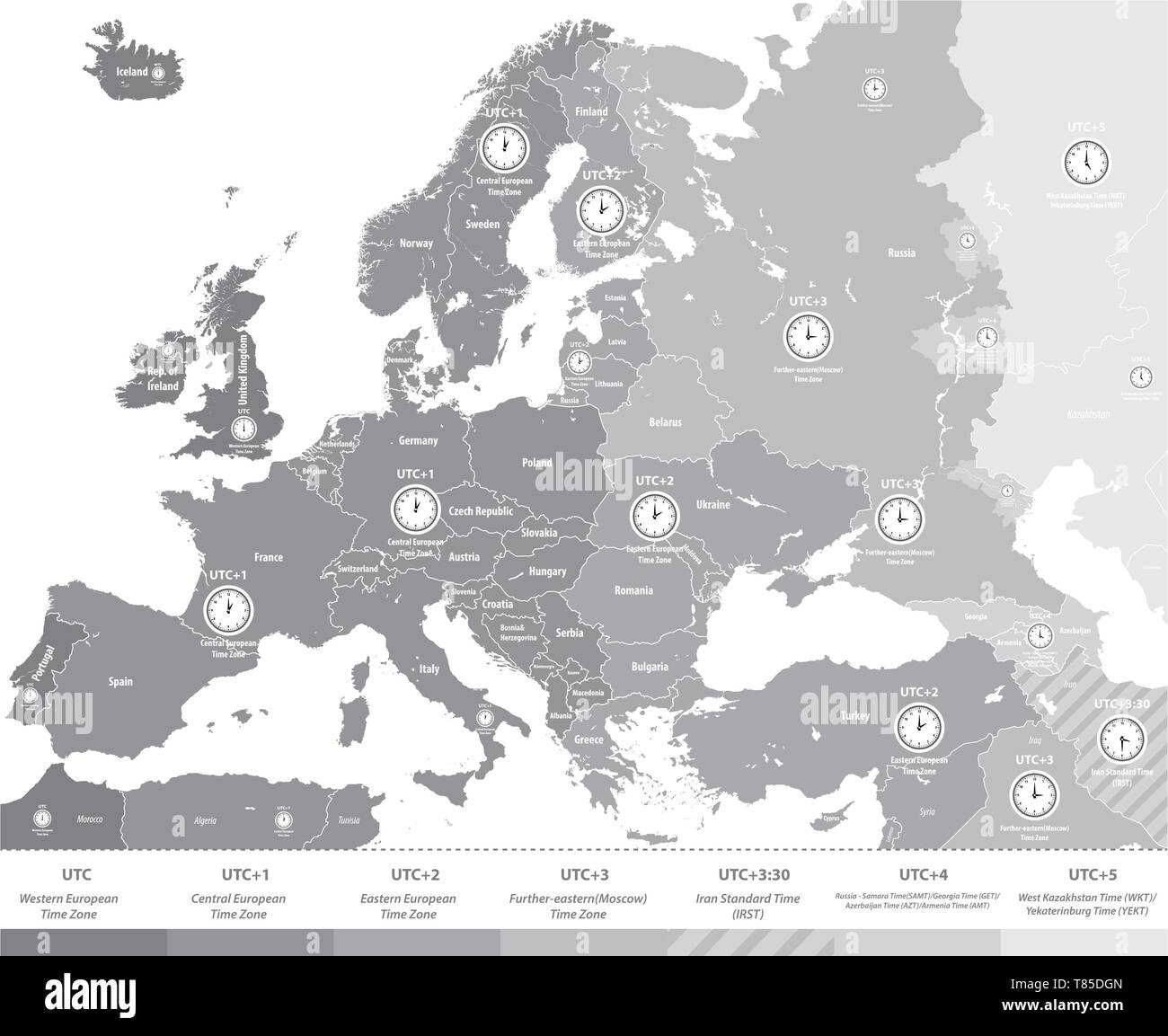 Las Zonas Horarias De Europa Trazan En Escalas Grises Con La Ubicacion Y Registran Iconos Ilustracion Del Vector Ilustracion De Horarias Zonas