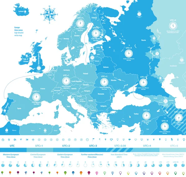 Las Zonas Horarias De Europa Arriba Detallaron El Mapa Con Los Iconos De La Ubicacion Y Del Reloj Ilustracion Del Vector Ilustracion De Reloj Ubicacion