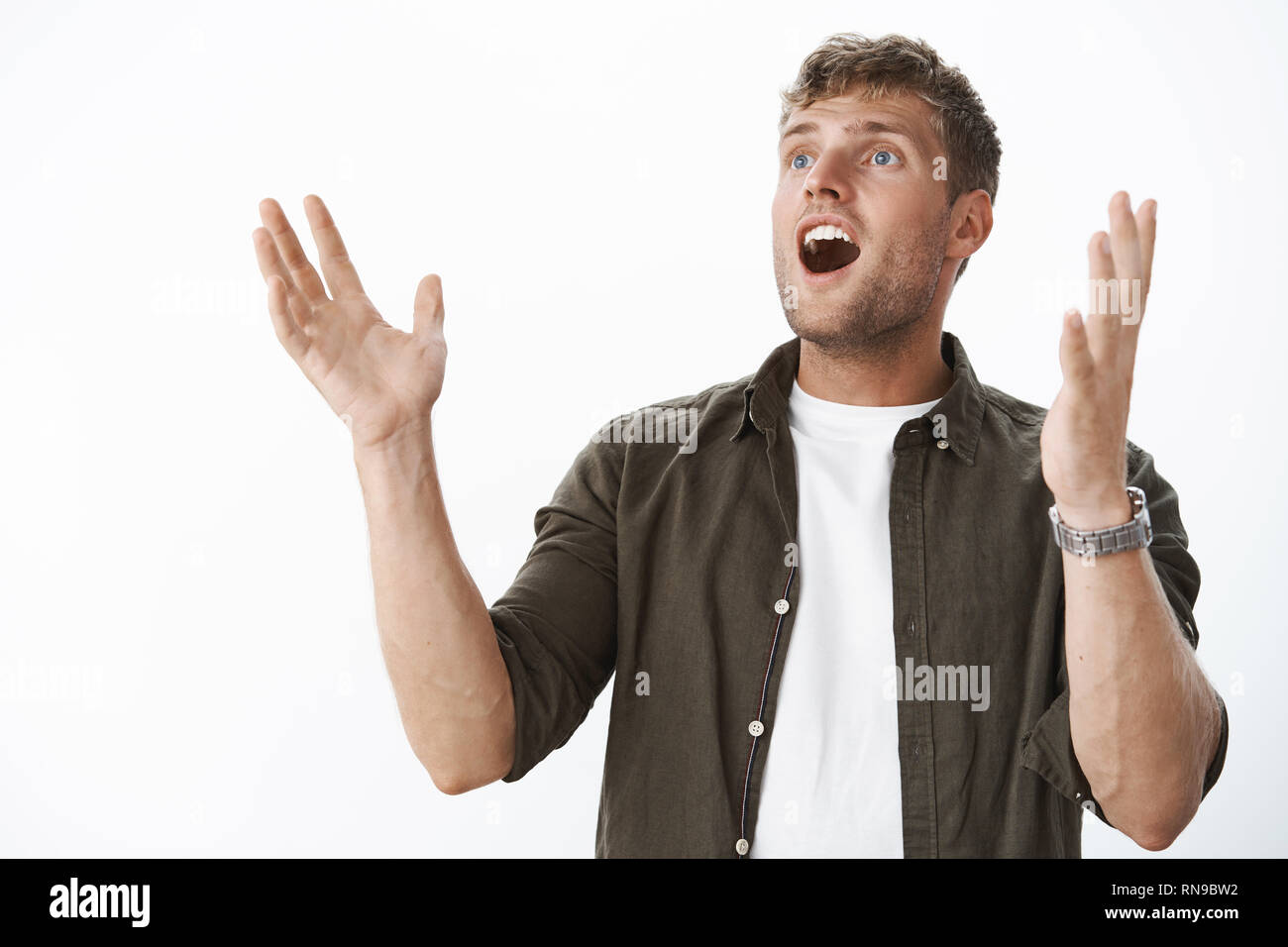Guapo Presenciando Milagro Justo Antes De Mandibula Caida De Ojos De Emocion Y Asombro Levantando Las Manos Y Esperanzador Impresionado Mirando Asombrados Fotografia De Stock Alamy