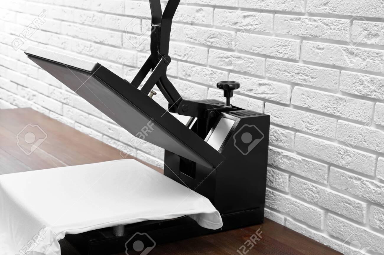 Heat Press Machine With T Shirt On Wooden Table Near White Brick Stock Photo Picture And Royalty Free Image Image