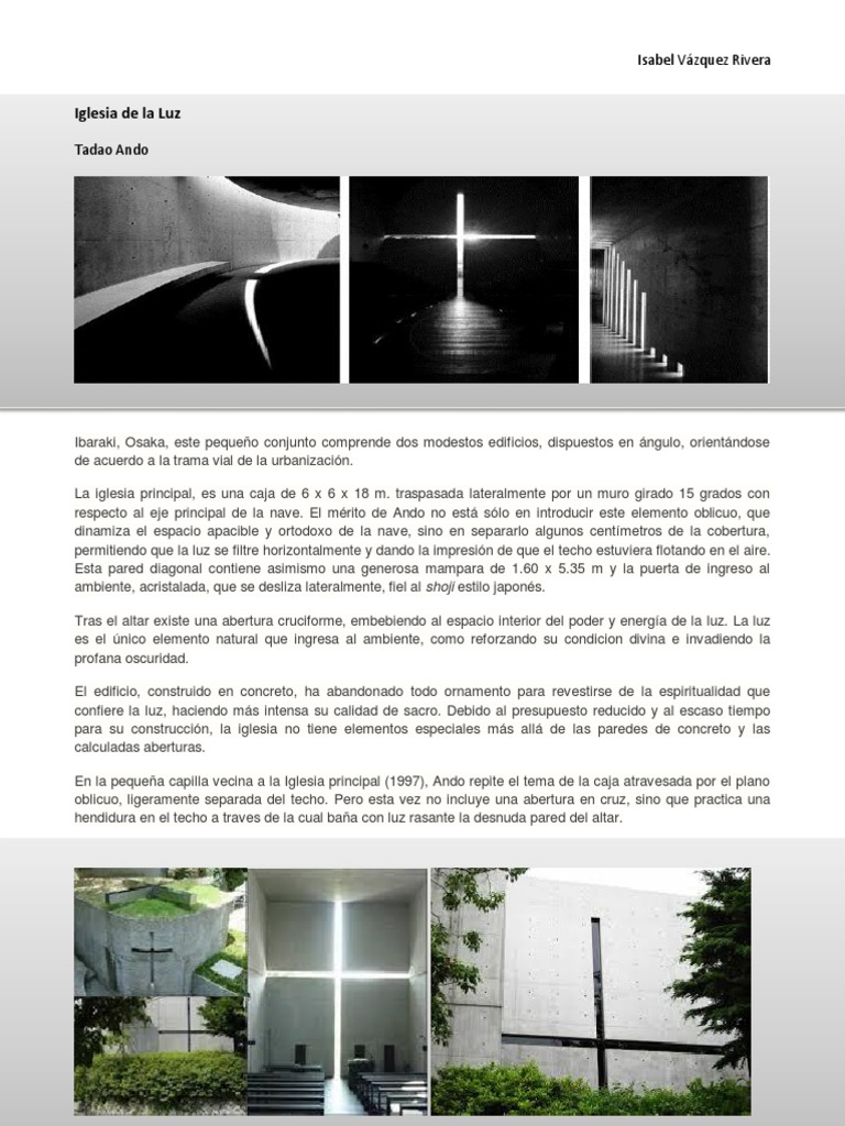 05ago14 En todas mis obras , la luz es un factor de control importante Puedo crear espacios cerrados , principalmente por medio de. Iglesia de la luz, una de las obras más icónicas de Tadao Ando, construida en 19 Los admiradores de la arquitectura japonesa están de enhorabuena, el centro George Pompidou ha arrancado su programa de octubre con una extensa exposición dedicada al trabajo de uno de los arquitectos más importantes del país nipón, Tadao Ando. Fig 2 iglesia de la luz 1987 – 19 ibaraki,osaka fig 1 iglesia en el agua 1985 – 19 tomanu,hokkaido fig 3 museo historico de chikatsu asuka 1990 – 1994 minamikawachi, osaka tadao ando –obras universidadprivada detacna – facultadde arquitectura y urbanismo seminariode historia y critica de la arquitectura fig5 fabrica en el.