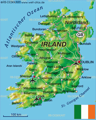 De 500 a 800 fue la edad de oro de la iglesia irlandesa Muchos monasterios fueron fundados a través de Irlanda y pronto los irlandeses enviaron misioneros a otras partes de Europa como Escocia e Inglaterra del Norte Los monjes irlandeses también mantuvieron vivo el aprendizaje grecoromano durante la Edad Media. Mapa da Irlanda tem dois países Você sabia que a Ilha da Irlanda tem na verdade dois países?. La República de Irlanda es un país de Europa occidental del archipiélago británico Limita al norte con el Reino Unido, al este con el mar de Irlanda y al oeste con el Atlántico Dota de una recortada línea costera junto a muchas islas, penínsulas y bahías.