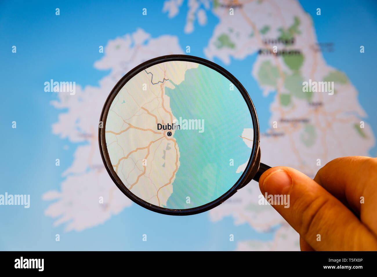 Dublin Irlanda Mapa Politico Ciudad Concepto Ilustrativa De Visualizacion En La Pantalla A Traves De La Lupa En La Mano Fotografia De Stock Alamy