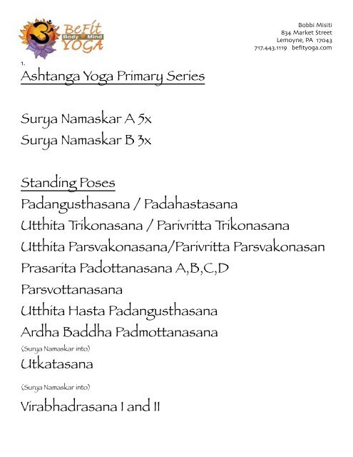 Yoga Chikitsa is the Sanskrit name of the Primary Series of Ashtanga Yoga, and it means “yoga therapy” Ashtanga Yoga The Primary. Traditional form Ashtanga Yoga Mantra Surya Namaskara A & B Fundamental Positions English Finishing Sequence Primary Series. Specifically, doing the poses the way I want my students to do the poses So, a little bit of ego, and a little bit of honest concern Anyway, here they are Feel free to download and share them Just don’t bring them into my Mysore room BTW all the pics are from the fantastic Tim Bermingham!.