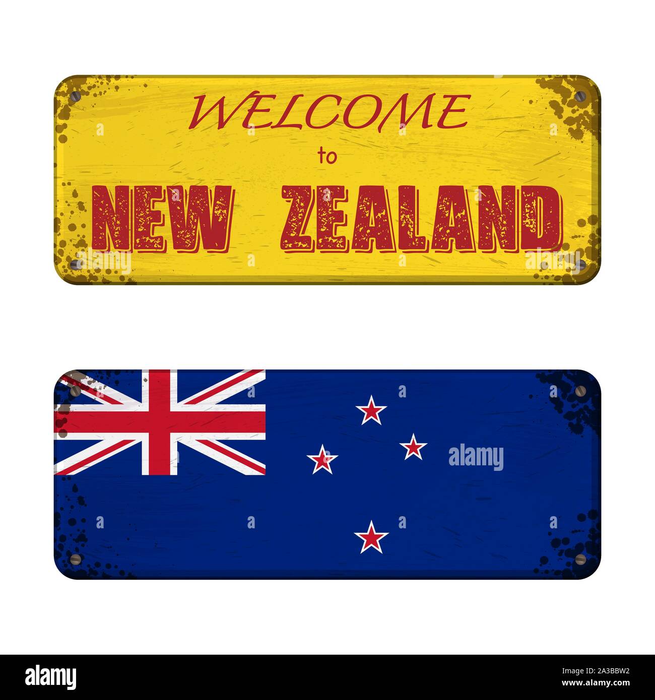 Two Old Grunge Nameplates With New Zealand Flag And Welcome Text Stock Vector Image Art Alamy