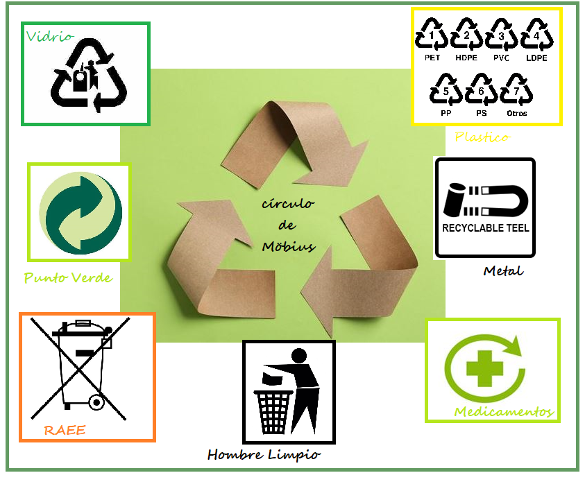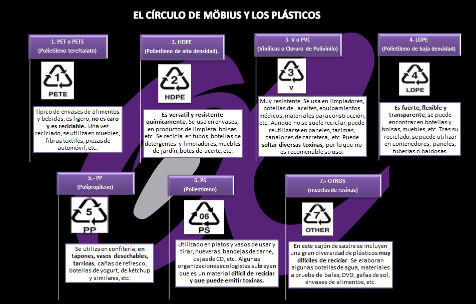 Círculo de Möbius Quizá el más reconocible sea el anillo o círculo de Möbius, que es el símbolo internacional del reciclaje, del que derivan otros logos que especifican datos como el porcentaje de material reciclado que tiene ese envase. 1 En general es PET, usado para botellas de alimentos y bebidas, enjuague bucal, condimentos, aderezos y botellas de agua 2 Suelen ser los HDPE, utilizado en envases de productos de limpieza, cosmética, detergentes, algunos jugos, leches y agua 3 Es PVC, un material duro, resistente y normalmente de color claro, facil de fabricar y pigmentarSe suele usar para fabricar tuberías. Cuentos para entender el circulo de Mobius Pese a tratarse de un símbolo que encontramos por todas partes, resulta complicado explicarles a los más pequeños porque el círculo de Mobi 10 Consejos para reducir la basura que generamos.
