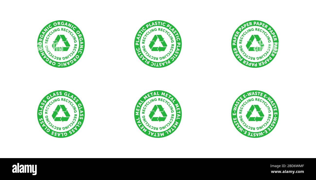 Juego De Reciclaje De Material Organico Plastico Papel Vidrio Metal Y Residuos Electronicos Distintivo De Circulo Verde Con Tira Banda O Bucle Mobius Elemento De Diseno Para El Embalaje De Imagen Vector