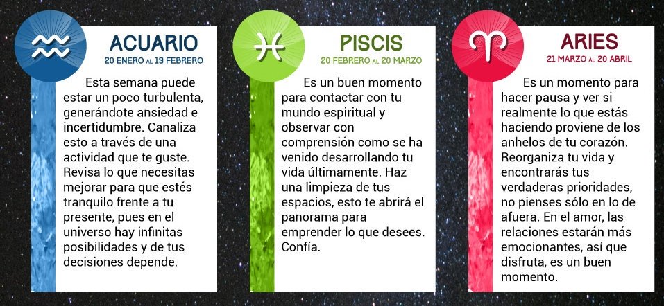 Horóscopo de Aries para esta semana (21 de marzo al 19 de abril) Las relaciones con el entorno serán el tema de la semana Venus se encuentra activada y puede influir en importantes decisiones. Comienza una nueva semana y las dudas empiezan a rondar tu cabeza, necesitas saber cómo te ira, necesitas calmar la incertidumbre, y en definitiva, necesitas leer el horóscopo semanal de Acuario Por eso aquí te traemos las mejores predicciones semanales para Acuario, el horóscopo para la próxima semana de Acuario que estabas esperando, así que. Esta semana te toca hacer un repaso de todo lo que has vivido en este Vas a darte cuenta de que te has equivocado muchas más veces de las que te imaginabas, pero a cambio, Acuario, te darás cuenta de que ahora eres mucho más maduro Ha cambiado la forma en la que te tomas las cosas.
