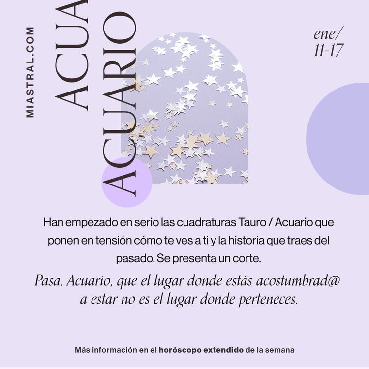 Esta es la predicción del Horóscopo de Acuario semanal para el amor Sois de este signo del zodiaco si habéis nacido entre los días de enero y el 18 de febrero Los que son de Acuario no tienden a creer mucho en el horóscopo, pero les aconsejamos que estén atentos a lo que les dice su pronóstico para esta semana porque pueden sacar. Esta semana los astros te aportan gracia, encanto y belleza Aunque no te sientas así es seguro que las otras personas si lo perciben Lunes y martes son ideales para hacer movimientos de dinero, abrir una cuenta, pagar deudas, planificar el presupuesto, consultarán o asesor o cobrar alguna deuda Miércoles y jueves lucen más afortunados para la comunicación y los desplazamientos, no dejes sin tiempo y espacio el objeto de tu amor. En esta semana tendrás que aprender a enfrentar la realidad y dejar de lado las ilusiones que te habías c Horóscopo Semanal Libra 23 sep 22 oct Horóscopo Semanal Acuario 22 ene 21 feb La semana se inicia con la llegada de noticias inesperadas en lo que se refiere al amor y los sentimiento.